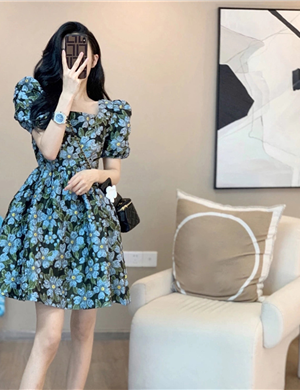 夏季高级法式复古设计感气质收腰显瘦碎花连衣裙女
